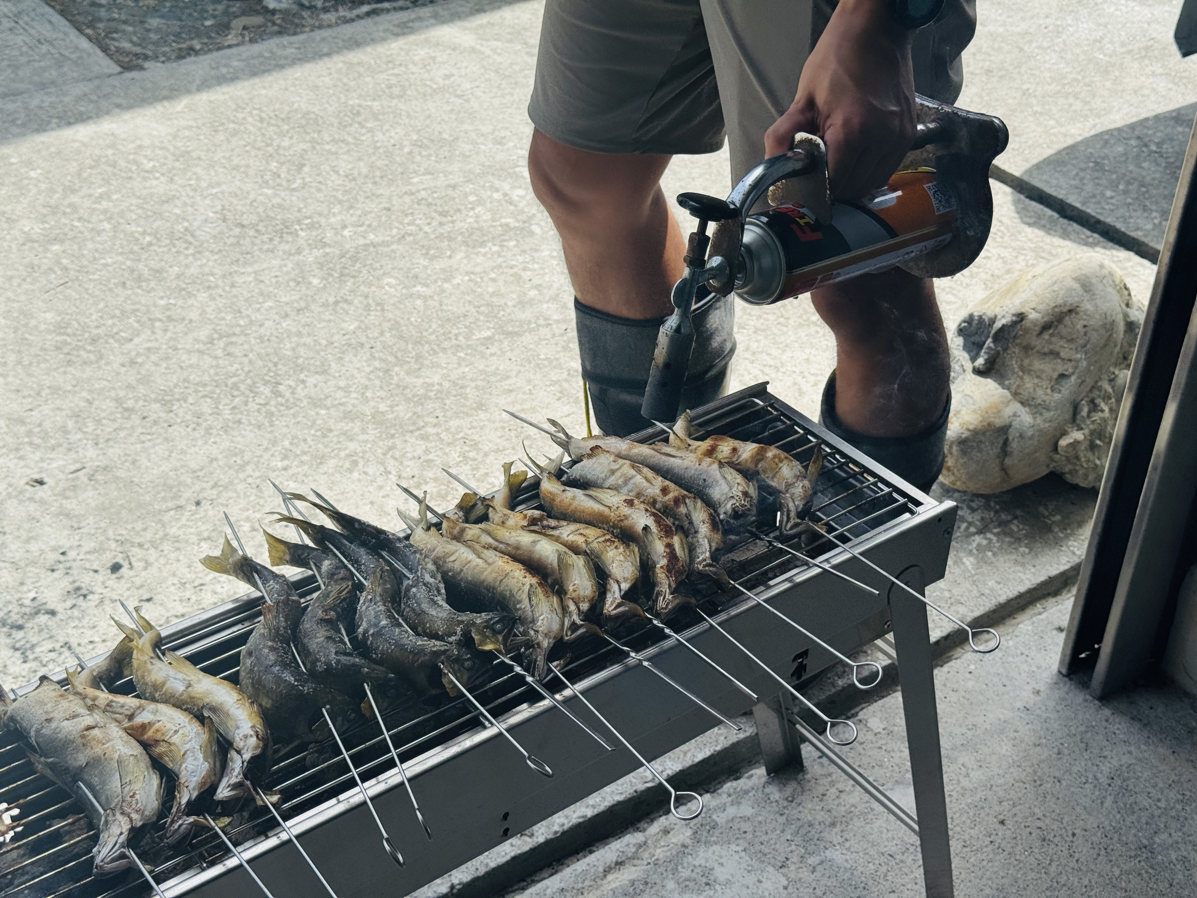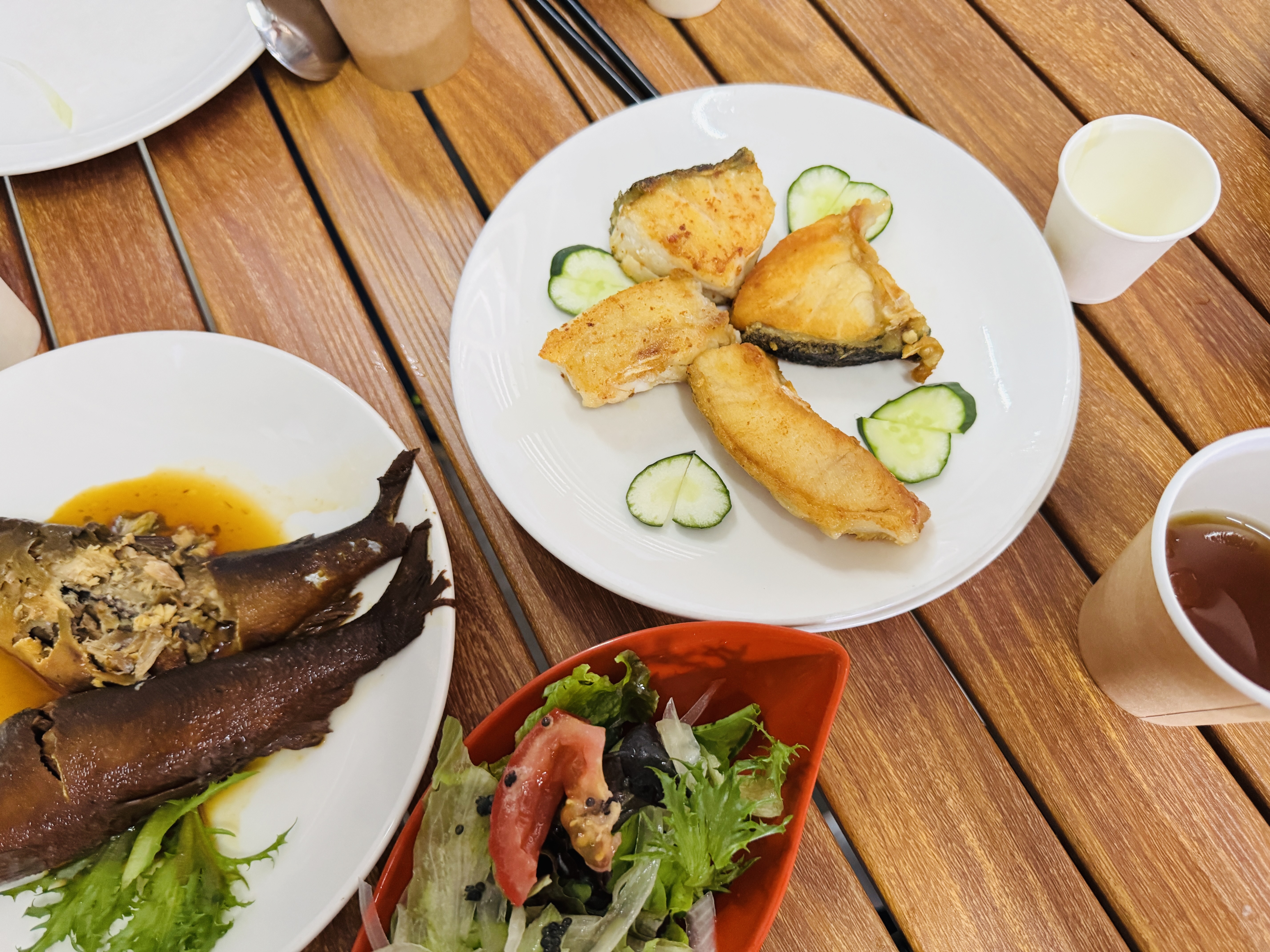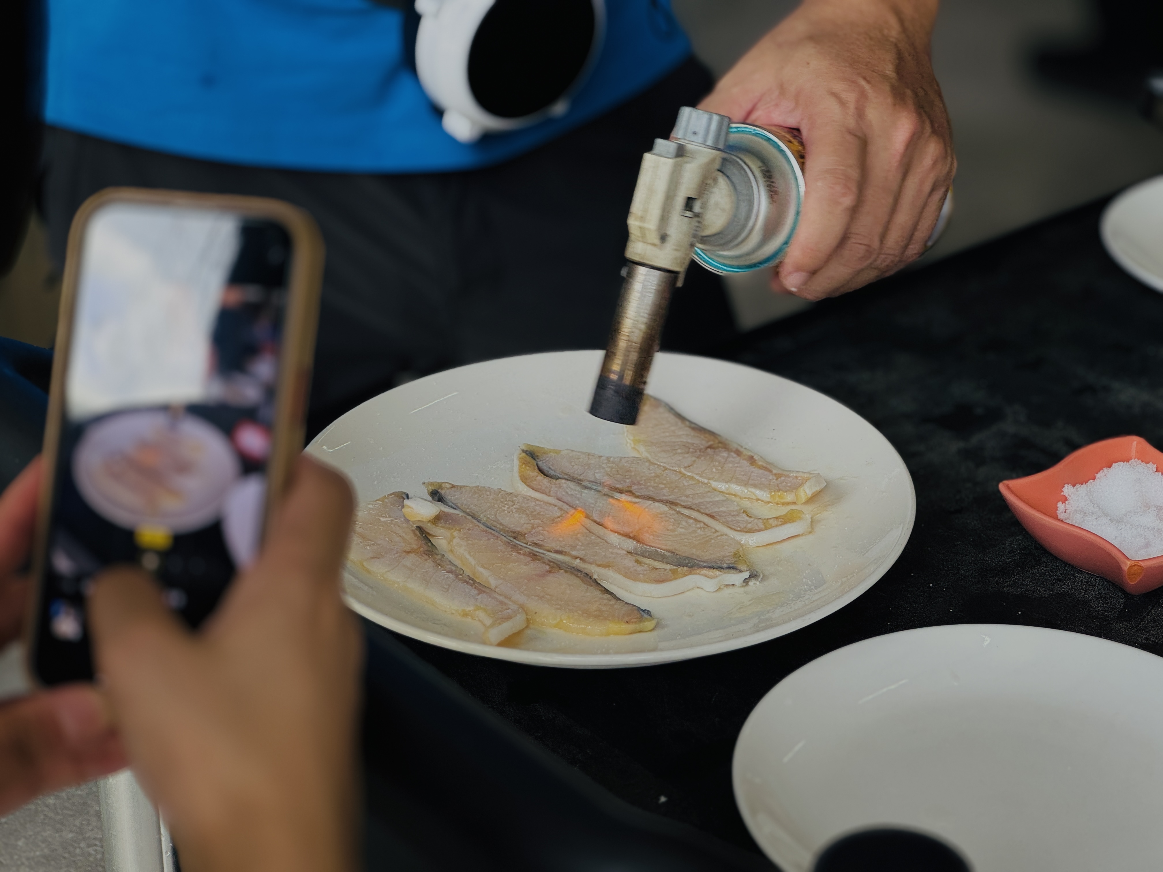 午餐時段,大家直接在漁場中擺起宴席,漁場主人許智越本身具有專業廚師背景,面對珍貴的鱘龍魚與墨瑞鱈自然是不馬虎,要讓大家品嚐到最在地、最新鮮的料理。從鮮美的香魚到肉質Q彈的鱘龍魚,每一口都能感受到智慧養殖帶來的高品質。