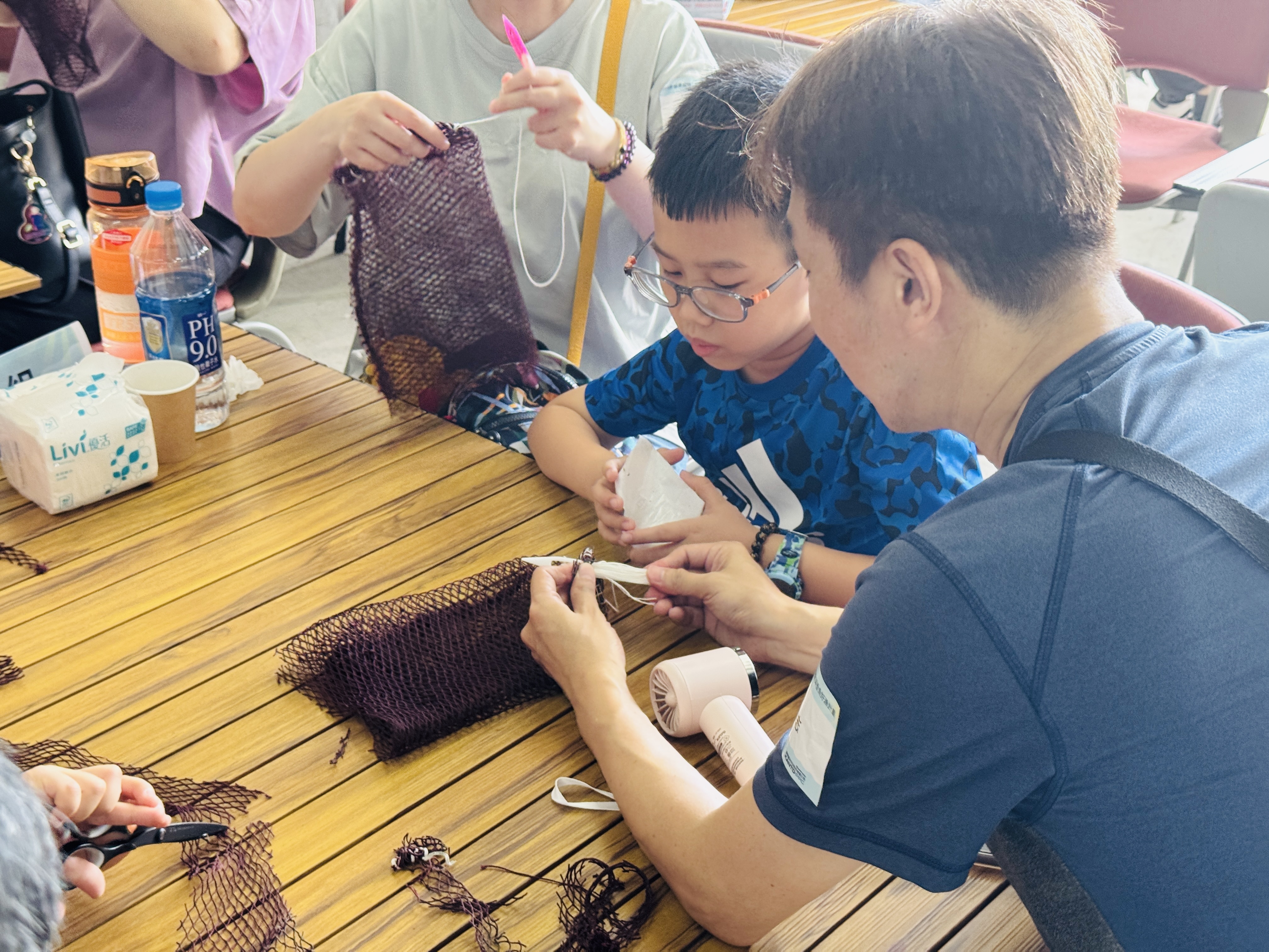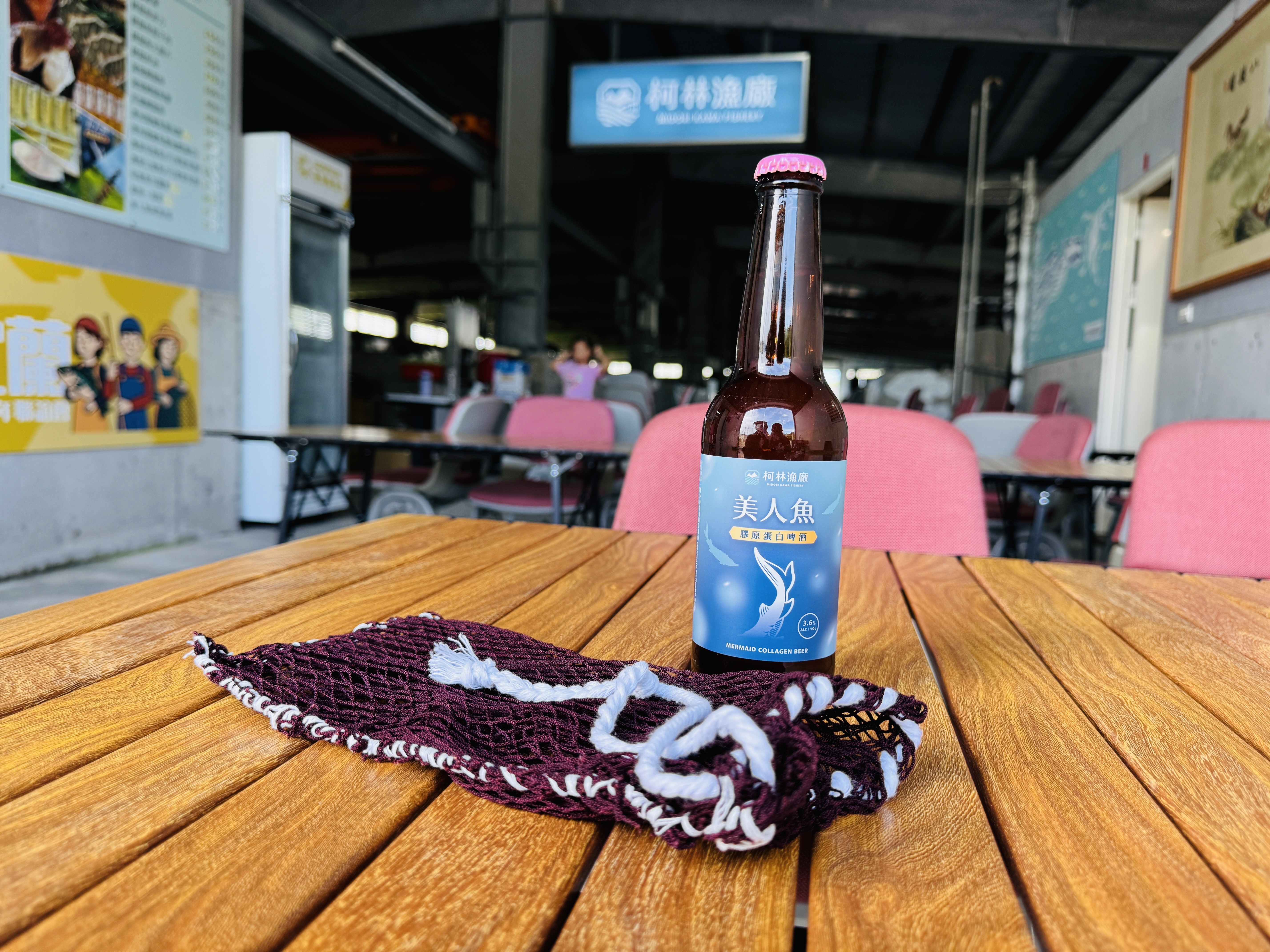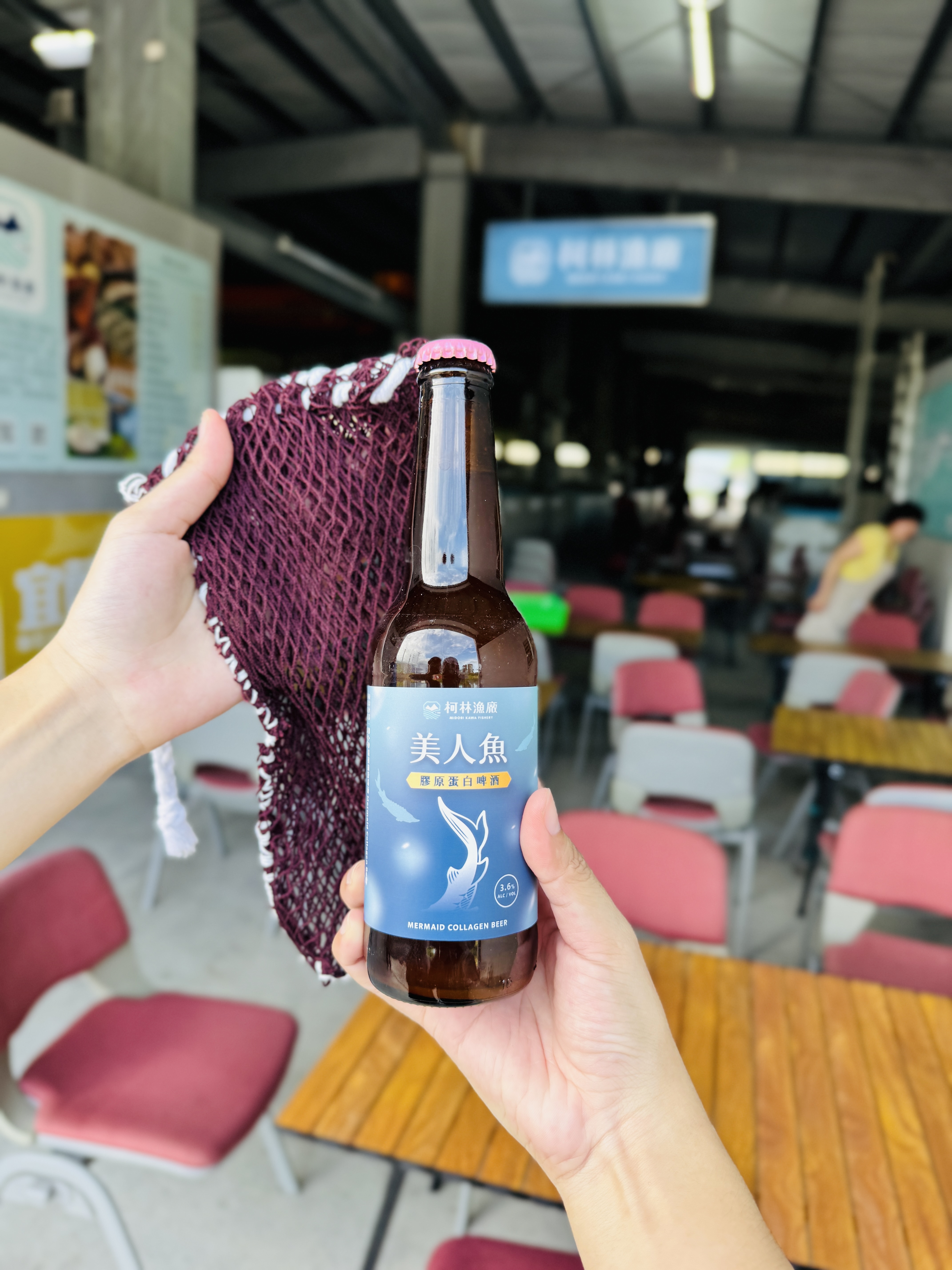 在養殖漁業中,漁夫日常工作除了巡視漁場、監測魚群健康狀況與餵食飼料等,另一項很重要的工作便是修補漁網,漁網經常在捕撈工作之間破了洞,通常只需簡單的修補就能讓魚網重獲新生,這是漁夫們惜物的美德,更是從生活中衍生的智慧。本次體驗希望藉由廢棄漁網再利用,利用魚網縫補技巧編織成網袋,學習漁村日常中縫縫補補的精神,理解資源不應被輕易捨棄。透過一繩一結的編織,將漁業廢棄物轉化為簡約時尚的網袋,落實零浪費的生活美學。手作網袋裝著美人魚啤酒,就是一份最棒的永續紀念品!