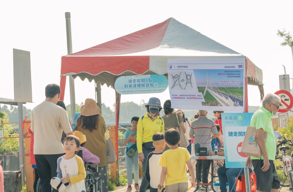 健走活動結合闖關設計,讓民眾近距離觀賞農田水利近 50 年來最大工程的震撼景象,並透過互動關卡認識水利工程與水資源調度的重要性,同時加深對在地社區特色的了解