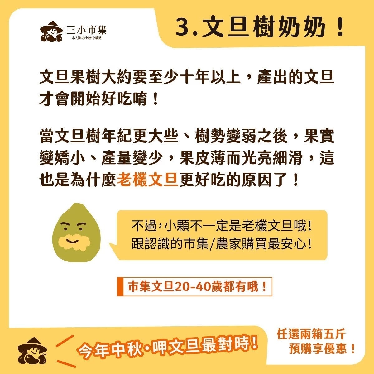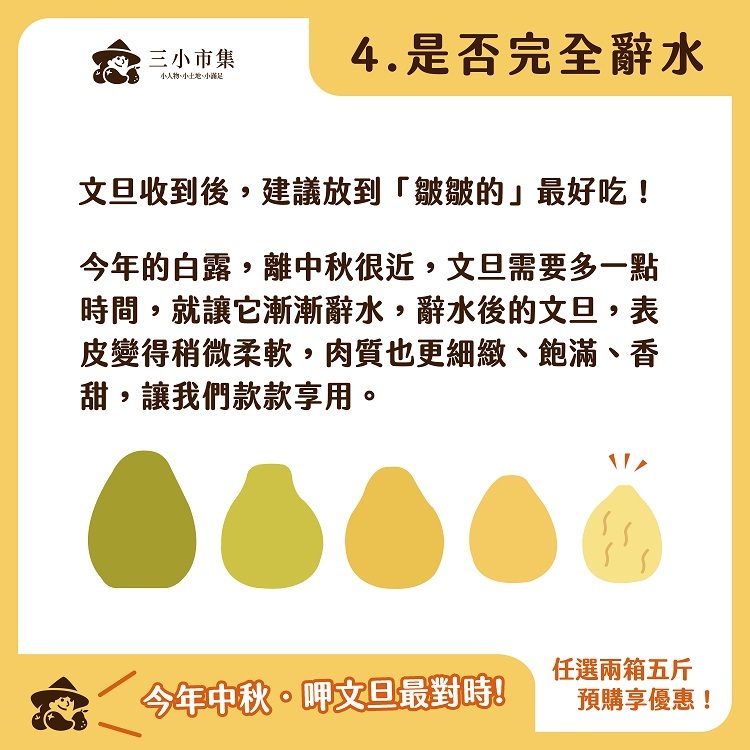 白露(國曆9/7或9/8),是文旦採收很重要的日子,農夫大約在白露前後十天左右陸續採收,接下來就是靜置在乾燥涼爽的地方,等待辭水。辭水後的文旦,表皮變得稍微柔軟,肉質也更細緻、飽滿、香甜。