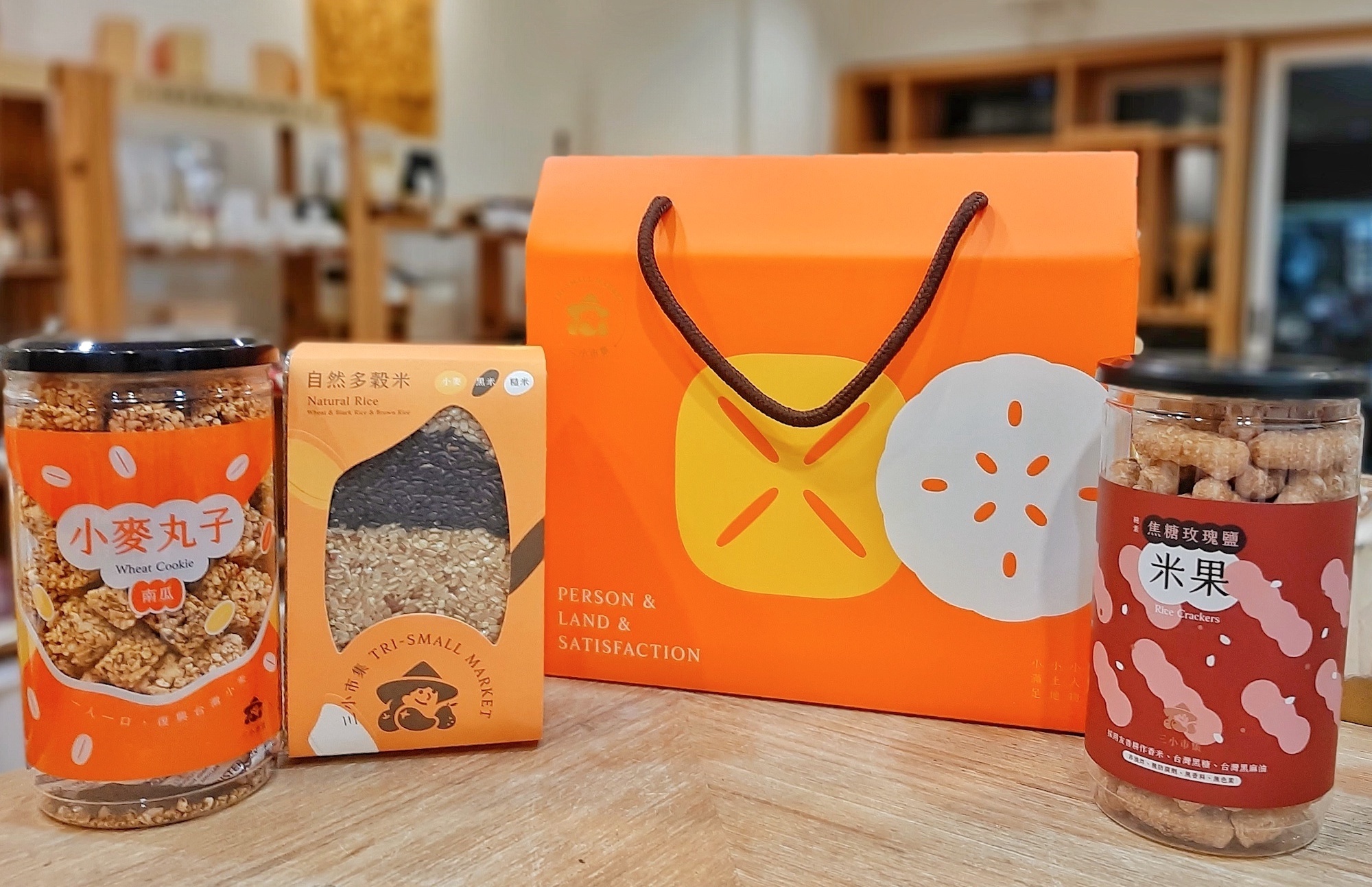 這份得來不易的禮盒,來自關東鑫林夥伴們,與三小市集友善耕作農友們的誠摯祝福:有今年三位農家黑米、糙米、小麥的「自然多穀米」、採用本土小麥製作的「小麥丸子(南瓜)」、採用桃園三號香米、台灣黑糖、雲林黑麻油製作的「焦糖玫瑰鹽米果」特製點心,無添加低負擔、十分適合團聚時刻共享!