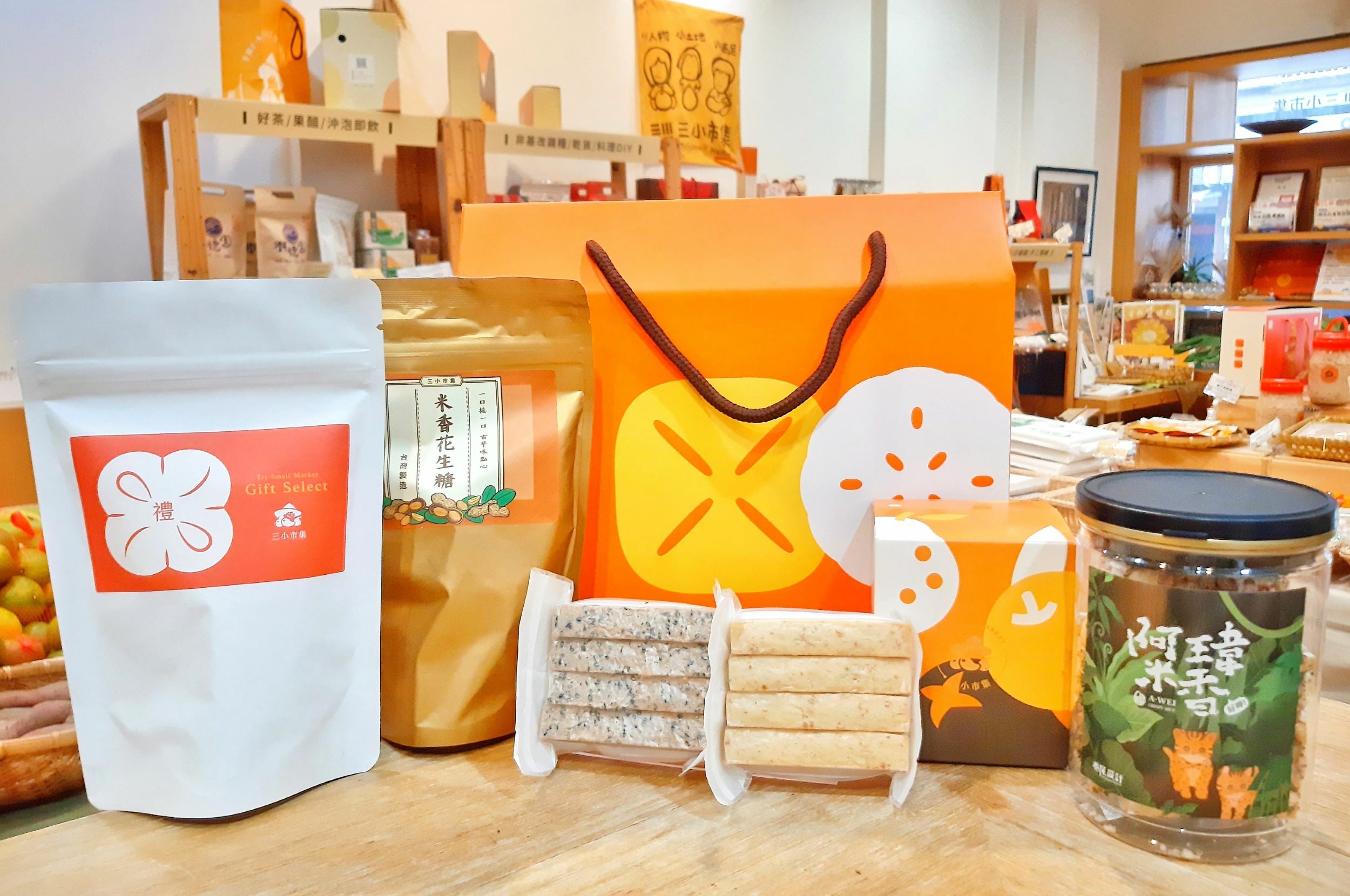 這份得來不易的禮盒,來自關東鑫林夥伴們,與三小市集友善耕作農友們的誠摯祝福:有「芝麻糊軟糖」、「芝麻花生糖」、「花生杏仁餅」、「芝麻雜糧餅」、「糙米花生芝麻棒」,無添加低負擔、十分適合團聚時刻共享!