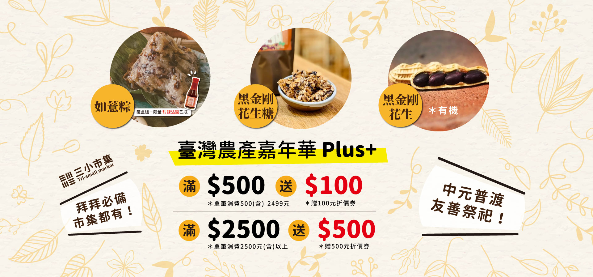 因應新冠肺炎疫情,三小市集的線上店舖,與農委會合作 台灣農產嘉年華PLUS+ 推廣活動,即日起至109/12/31,在三小市集官網專區選購指定商品,滿 500 元即送 100、滿 2500 送 500 折價券!