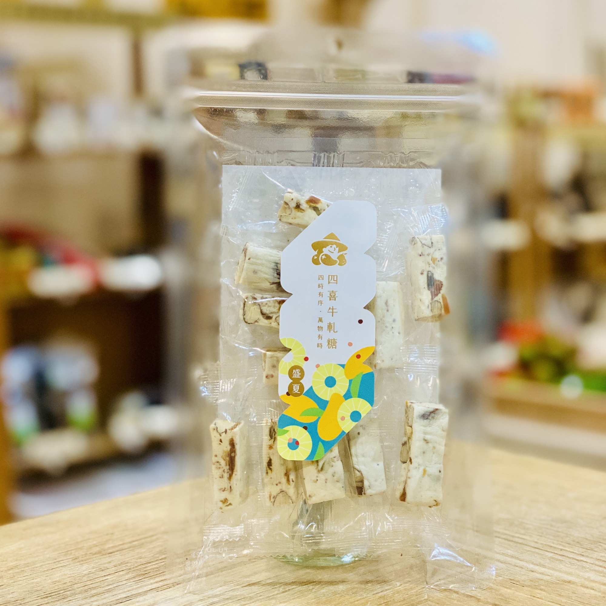 經典四喜牛軋糖,烘焙出新鮮杏仁果的香氣與甜度,並融入四款友善耕作的穀物與原片果乾,交疊出豐富層次的滋味與口感,成分單純無防腐劑、無人工色素、無香精。