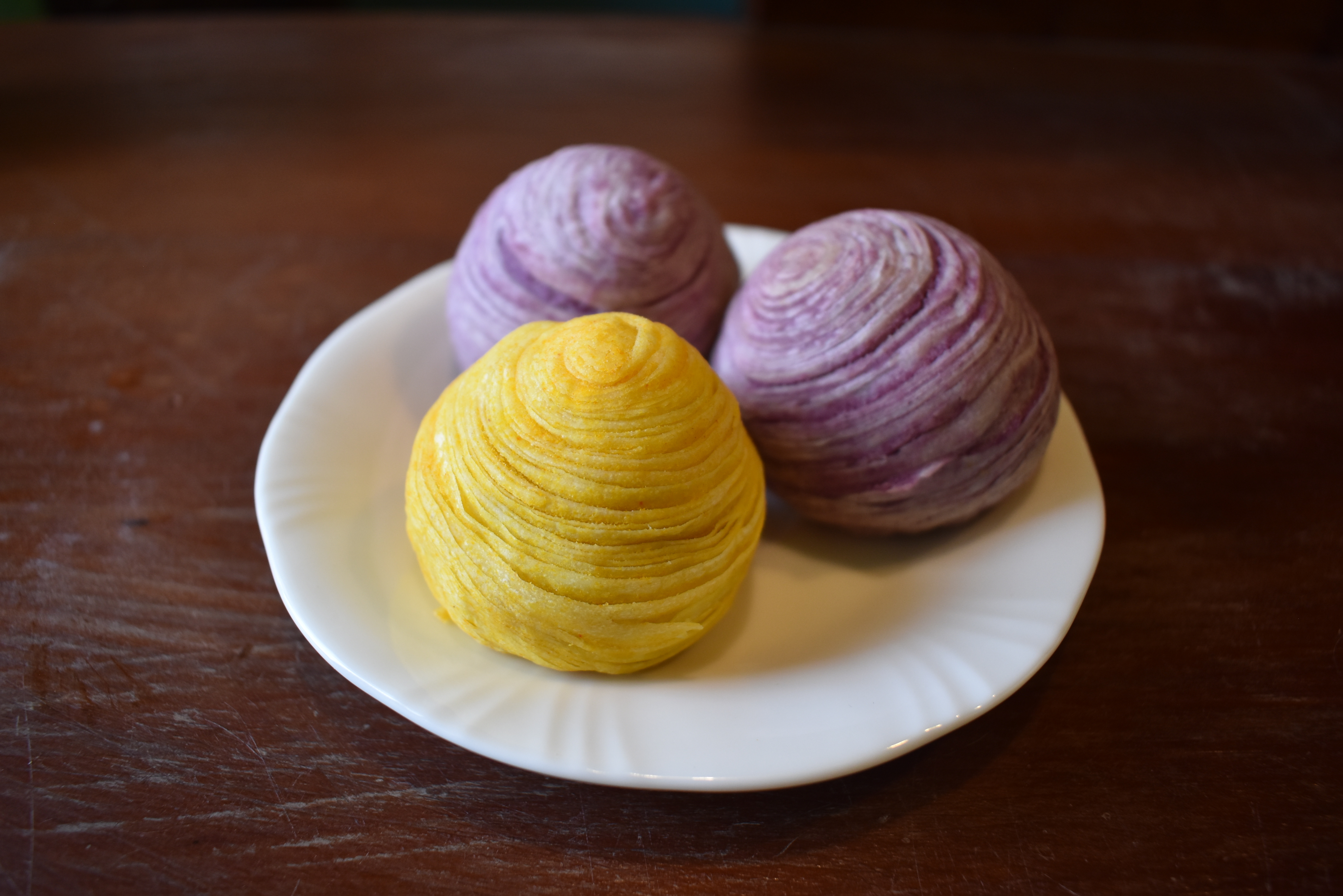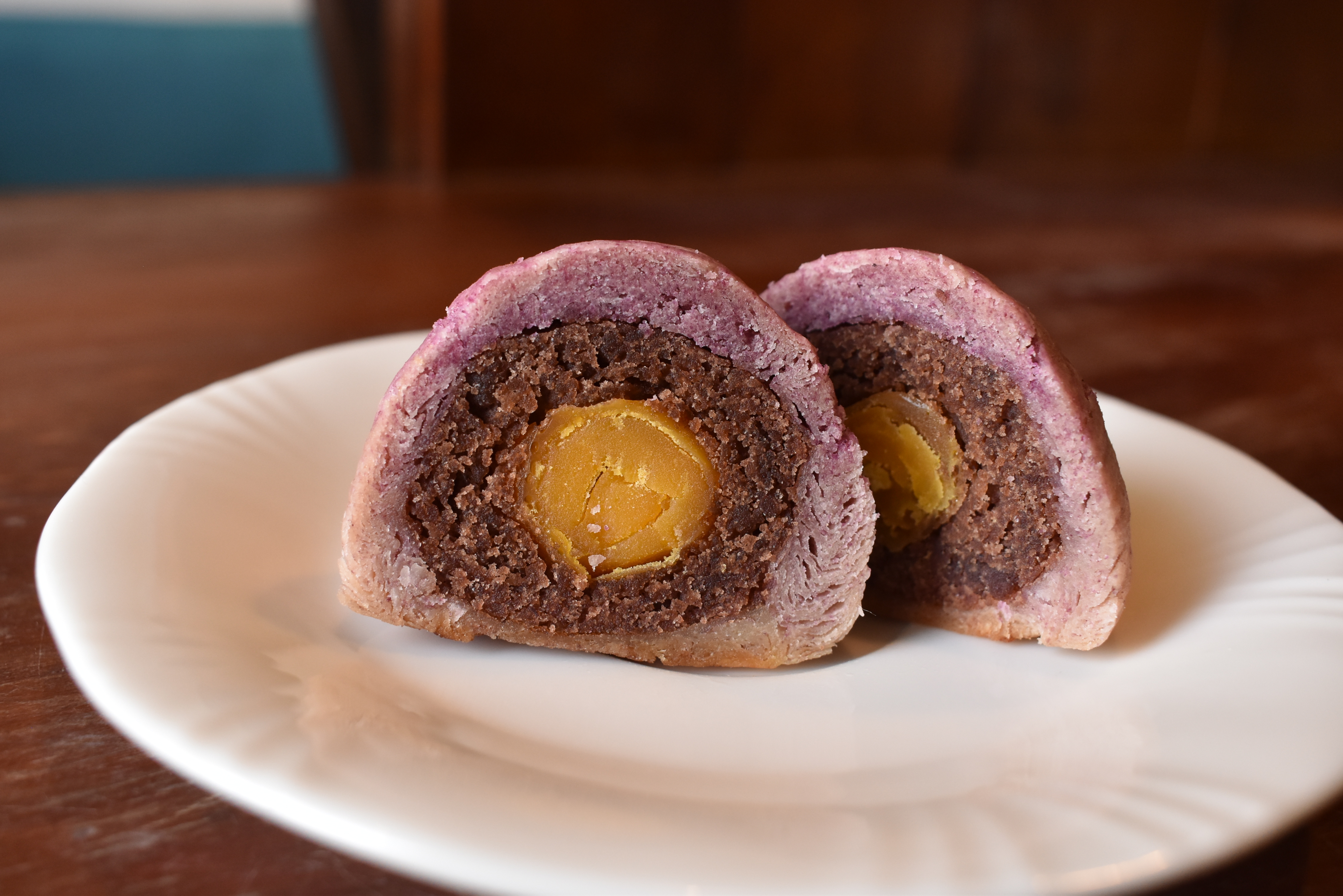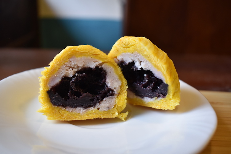 夏末初秋的季節,是市集農友Chitta家檳榔心紫芋豐收的日子「耐著性子慢點收,芋頭在田裡更成熟會更好吃呢!」烘焙師傅加入少許糖將之製成淡紫的芋頭餡、搭著新鮮禮華大哥的紫米粉、裹成糰包覆其中,餅皮加入家榕姐復興社區的天然黃梔子萃取粉,自然的金黃色澤,芋頭與紫米融合成一口接一口的簡單美味、細細品嚐,十分寧靜而美好。