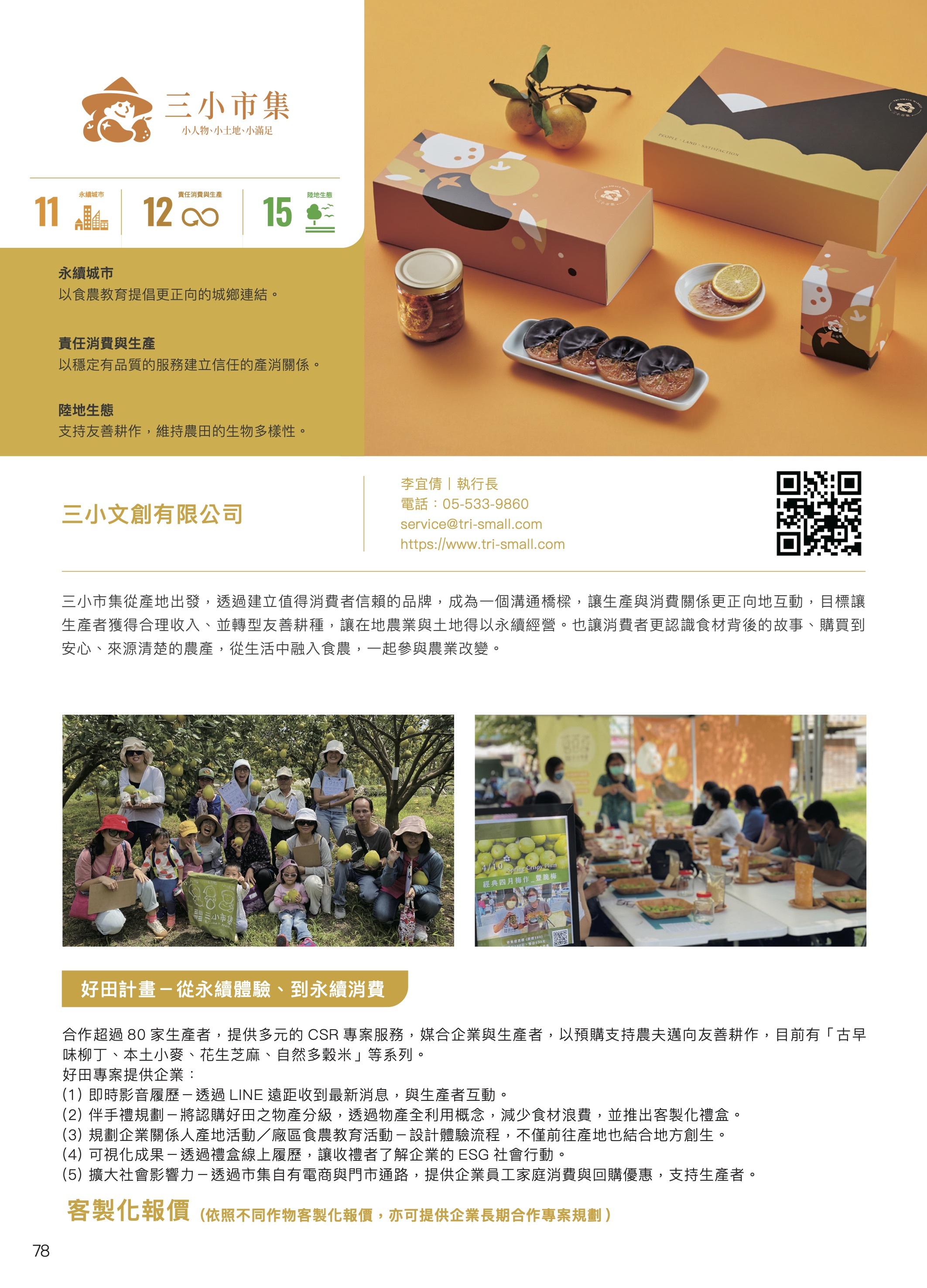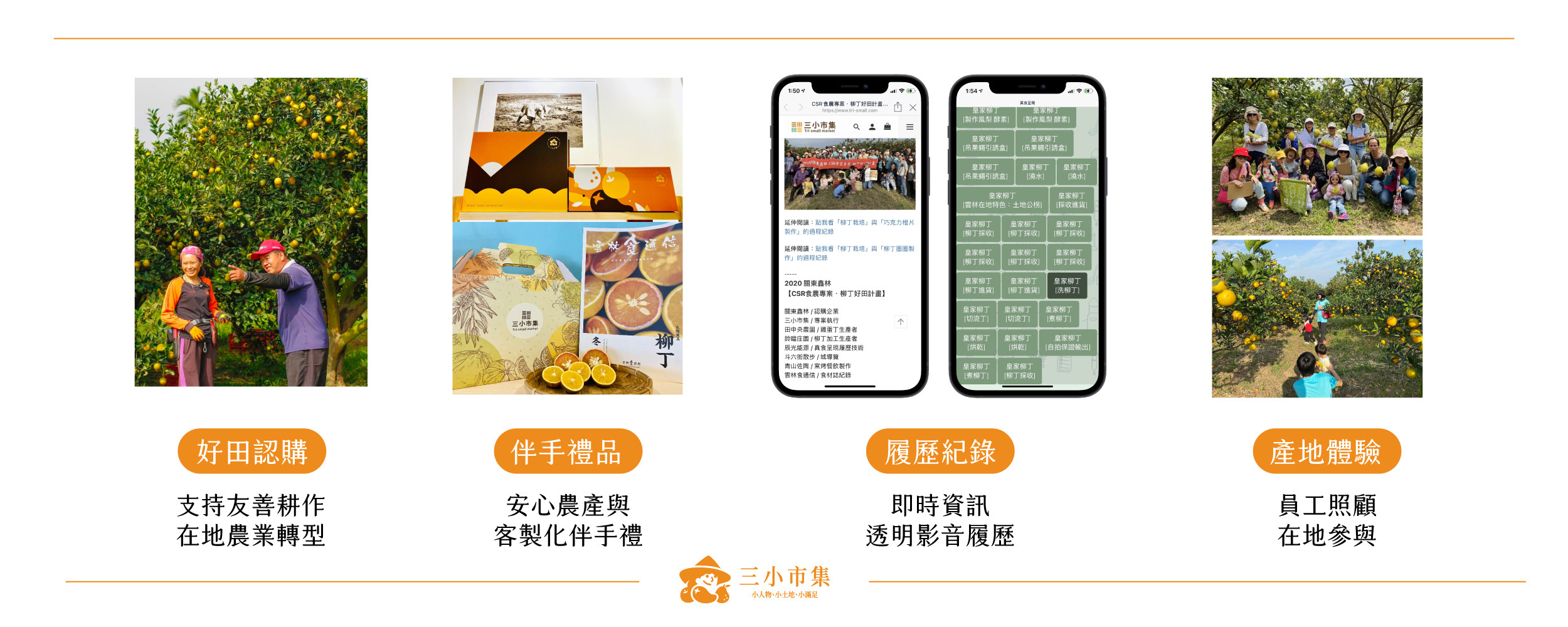 好田計畫方案,透過企業認購好田,支持生產者友善耕作,三小市集團隊提供完整的ESG專案服務,包含「好田管理、即時影音履歷、精緻伴手禮規劃、企業員工產地活動、企業專屬網頁」等,整個耕種與加工過程,可在禮盒上Qrcode一目瞭然,讓收禮者更清楚企業的社會行動。