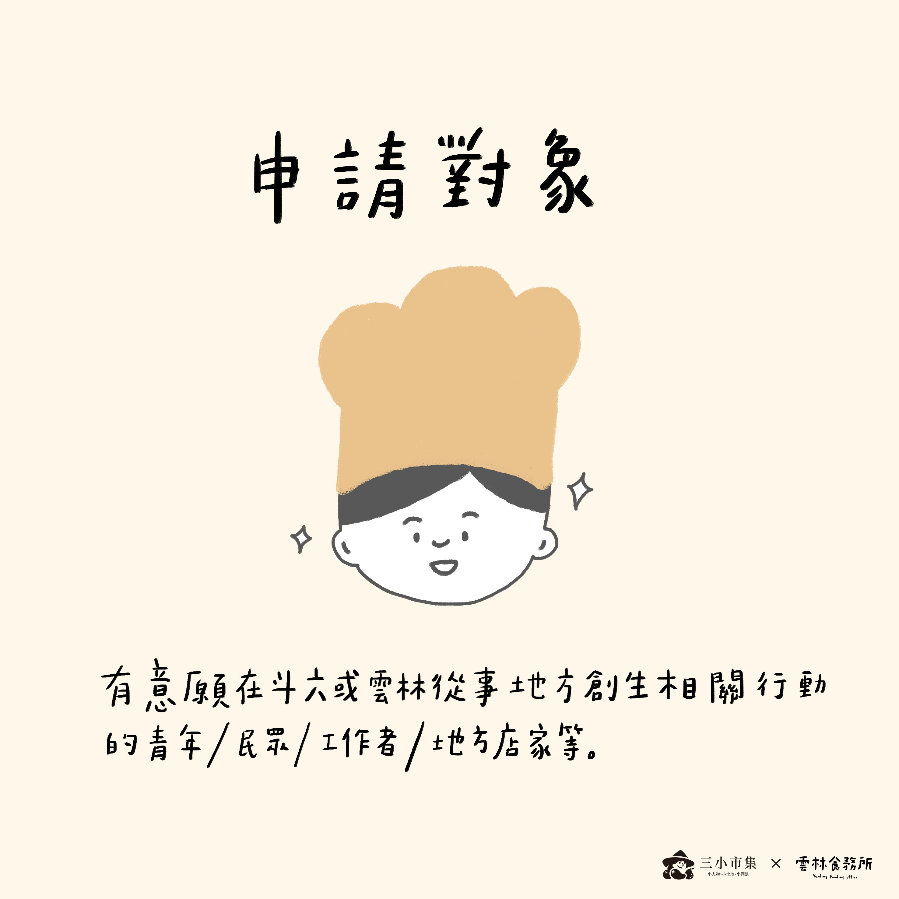 有意願於斗六或是雲林地區從事或進行地方創生相關行動之青年/民眾/工作者/地方店家等,或與雲林地區食產業合作者(原居住地不限,但行動需位於雲林或與雲林產業有相關)。
