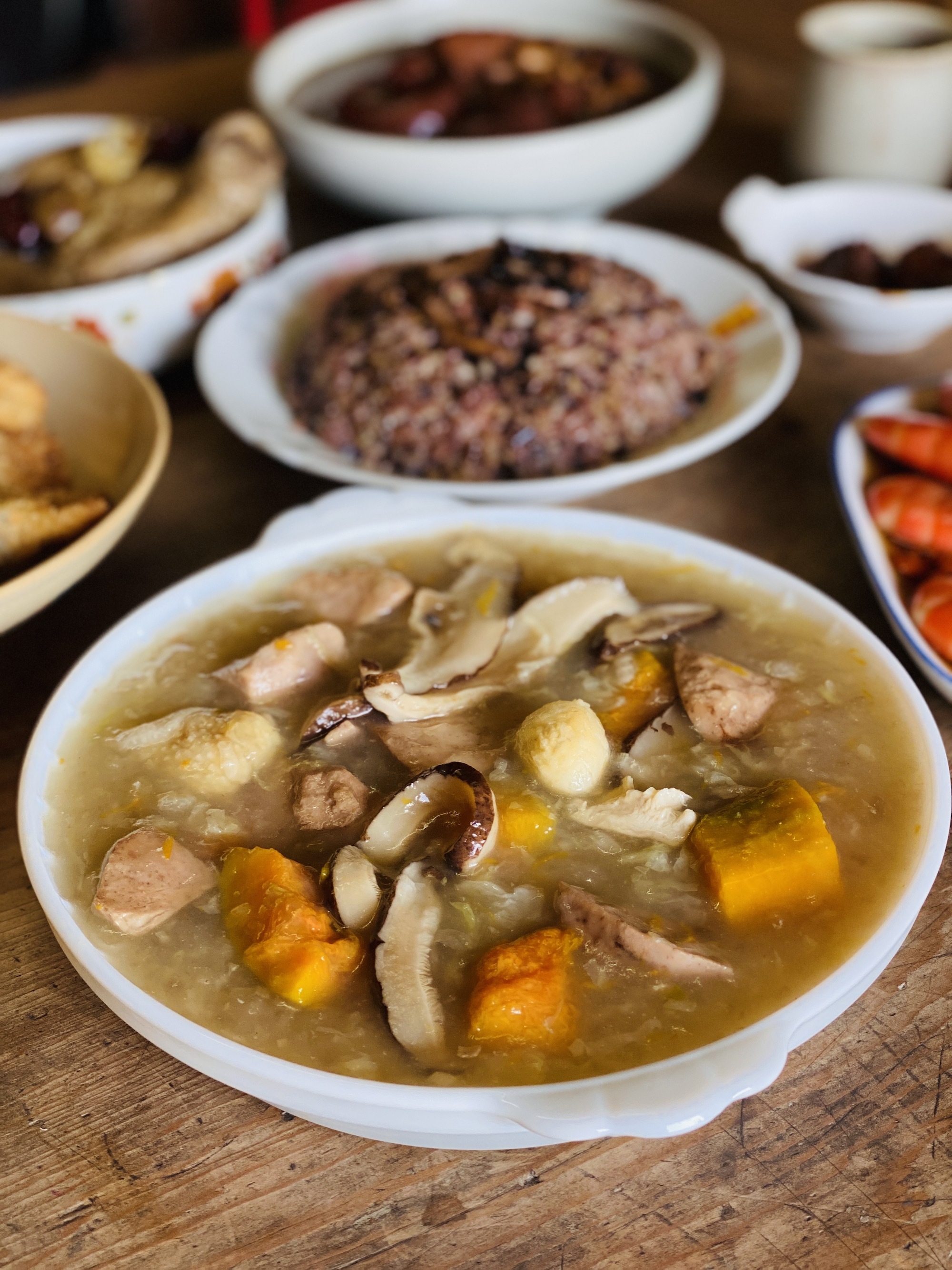成分 / 高湯(蝦、豬、雞)、芋頭、南瓜、大白菜、閹雞、乾香菇、鳥蛋、薑、台灣日曬海鹽、水、葛鬱金粉