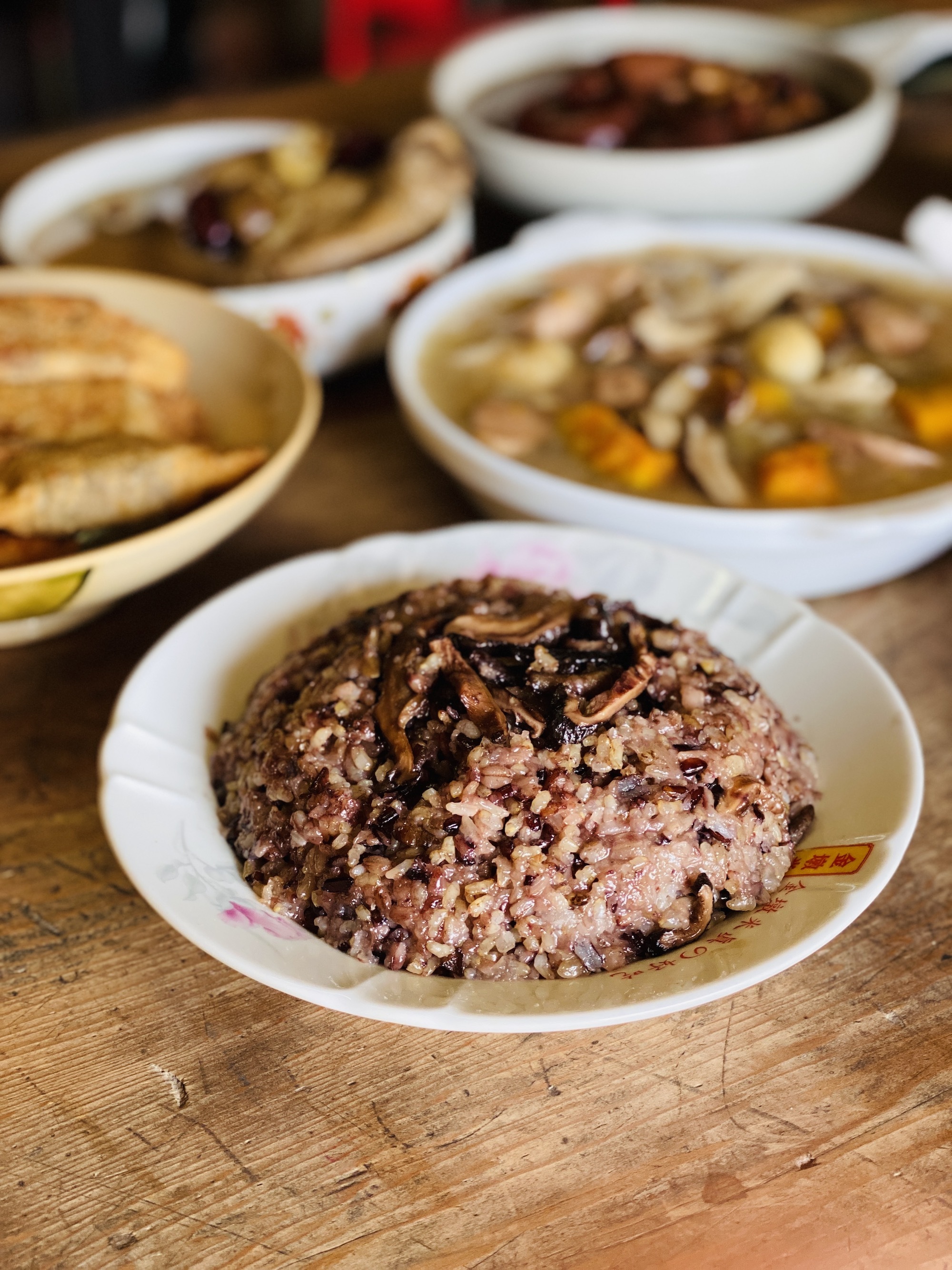 過往使用糯米為主原料的米糕,對於消化不好的朋友或長輩吃多了就會胃脹氣,於是廚師加入顧胃的本土小麥粒、友善黑米、糙米、白米等多穀食材,降低糯米使用比例,不僅不易脹氣、還有Q彈口感.而在雲林,也有在麻油雞料理中加入桂圓中,不僅溫補,其自然甜味也讓湯頭更香甜回甘。因此在米糕中特地加入農家自產的桂圓一起烹煮,帶出米糕鹹中帶甜的風味,佐以純黑麻油的香氣,成就象徵團圓的多穀米糕!