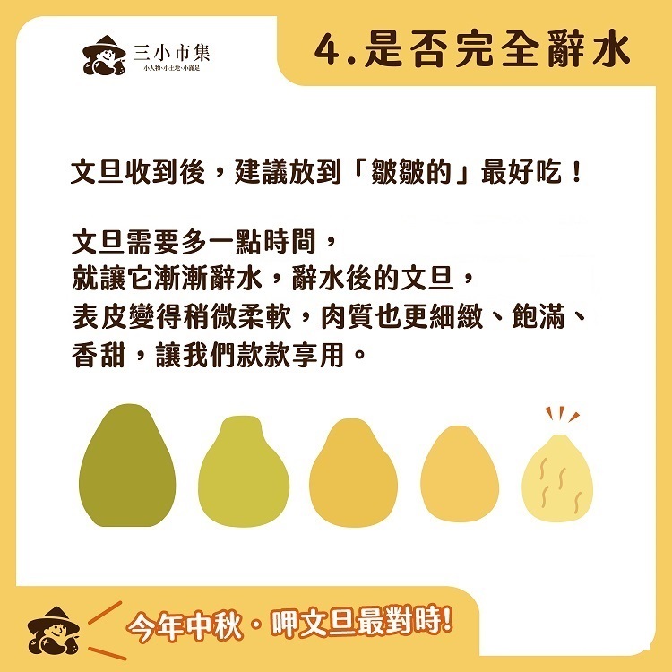 今年的文旦,有充足的時間熟成,有充足的時間辭水,所以越到中秋越好吃,敬請耐心等待,按壓文旦的表皮有些柔軟皺皺,就可以準備開動囉!