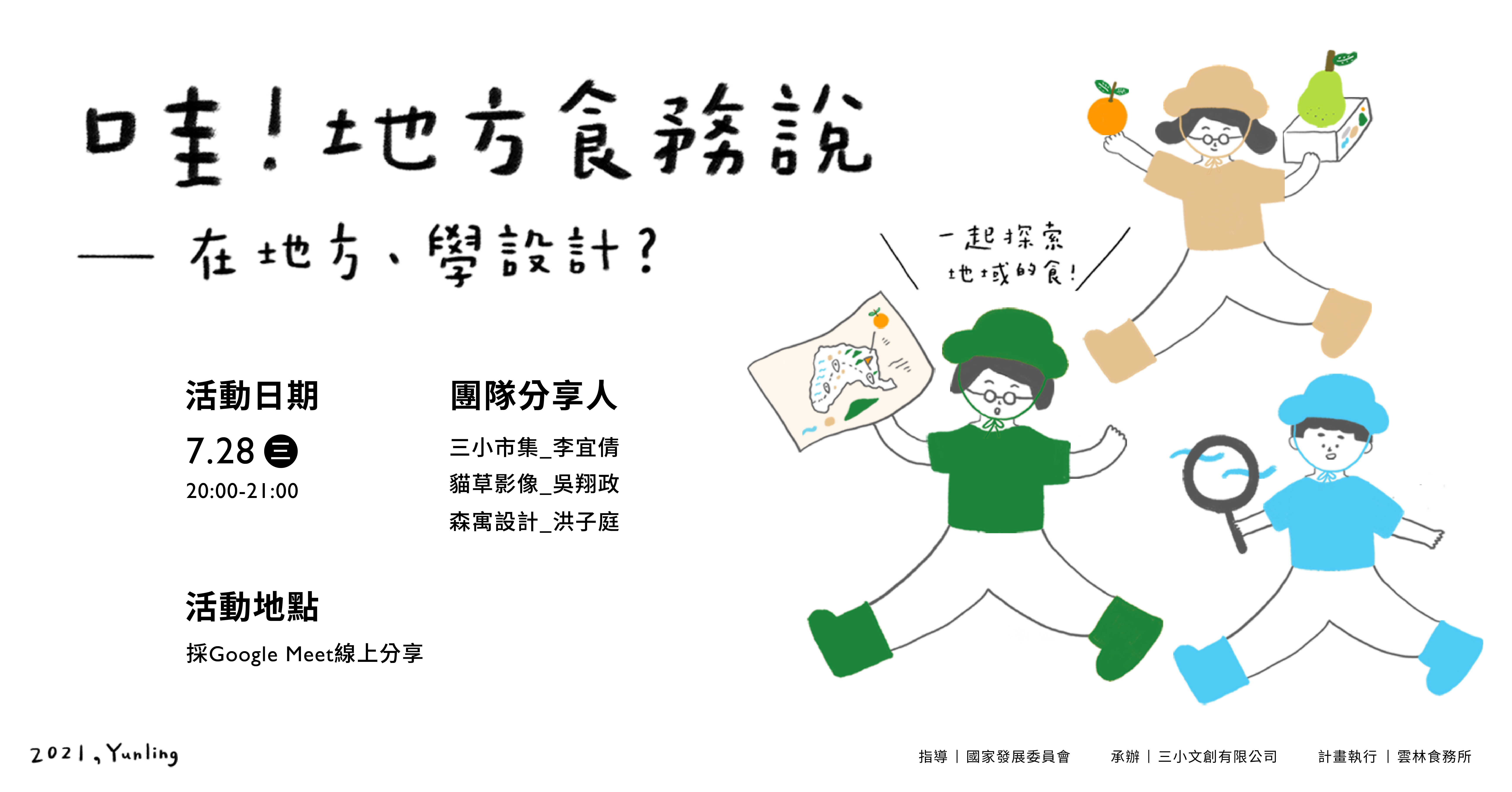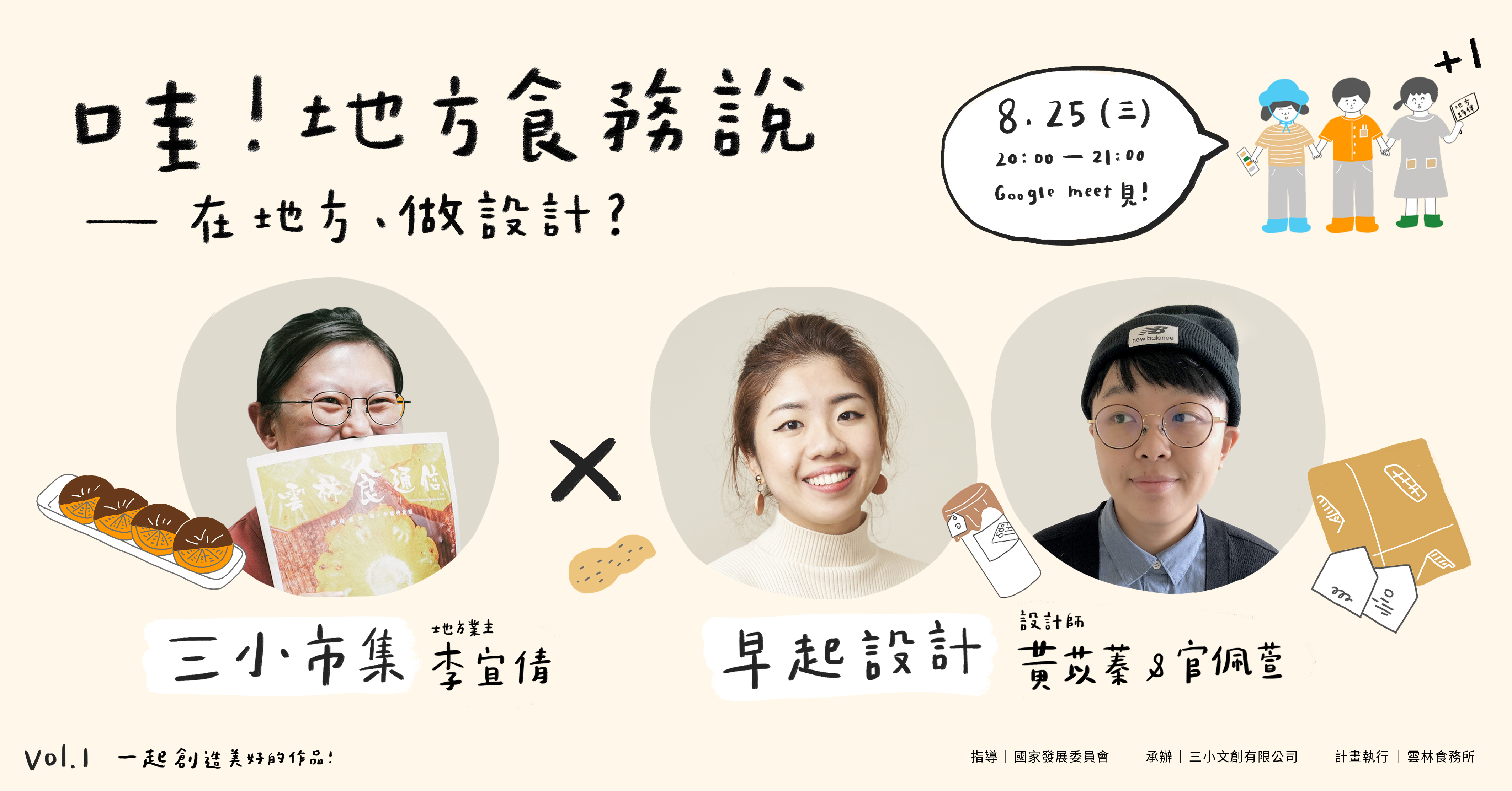 本次食務說邀請雲林食務所三位成員及特別來賓中區地方創生輔導中心賴玉珍副處長,他們同為在雲林學習設計的地方朋友,來聽聽他們的食務經驗。本場次也可以更詳細了解食務所接下來的計劃哦!