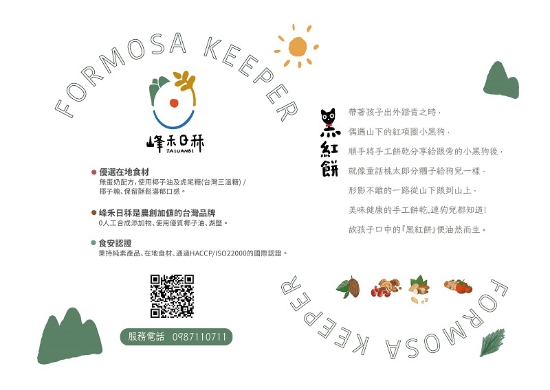 峰禾日秝是一家農創加值的台灣品牌。販售零蛋奶烘焙品、茶點小品、多穀茶、咖啡。也同時服務企業禮贈需求、消費零售、市集活動。
