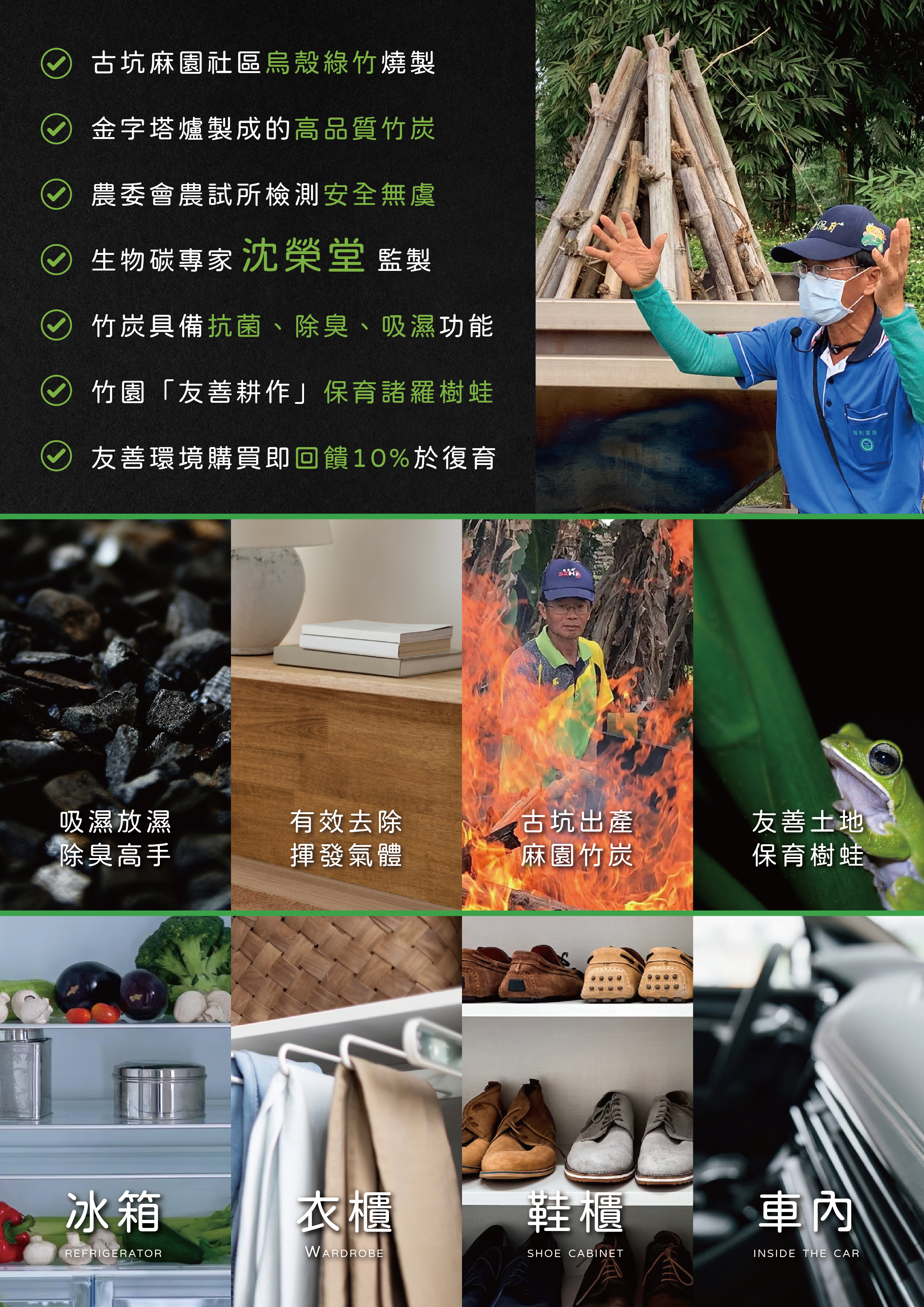 麻園生物炭包以「社區農業資源再利用」為核心理念,選用友善耕作並獲得綠色保育標章認證的烏殼綠竹,經高溫碳化後製成高品質生物炭,吸濕除臭效果佳,可有效淨化空氣,適合放置於衣櫃、鞋櫃、車內,讓空間保持清爽乾淨。