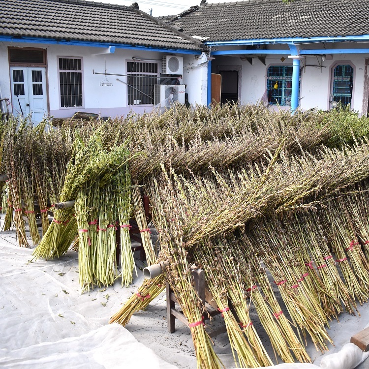 芝麻採收要觀察整支芝麻桿變得有些黃色,以人工方式採收回來後,再以一把為單位捆緊後日曬約十天的時間。