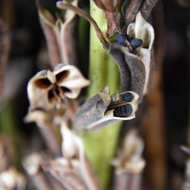 乾燥後的芝麻莢會打開,倒立後芝麻就會掉下來了。