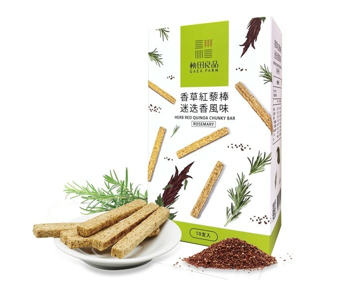堅持使用花蓮在地「台灣原生種有機紅藜」花東縱谷得天獨厚的環境及肥沃土地,孕育優良品質紅藜,結合來自 「花蓮君達休閒農場」種植之有機迷迭香,添加芳香口感,香草紅藜棒越嚼香氣越香。